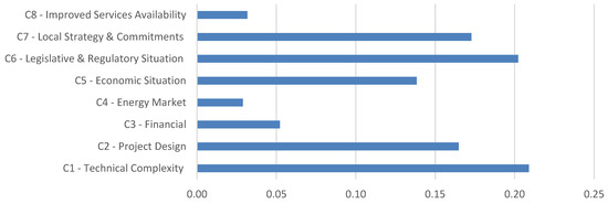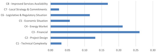 The “Energy market” criterion concerns the volatility of the energy market in the country where the sustainable energy project will be developed. The energy prices and market dynamics, such as carbon pricing, emission limits, and renewable energy mandates and taxes volatility factors, are included in the context of this criterion concerning the unpredictability of energy prices and taxes, which can significantly impact the expected monetary savings of a sustainable energy project and thus its financial performance [41,42].