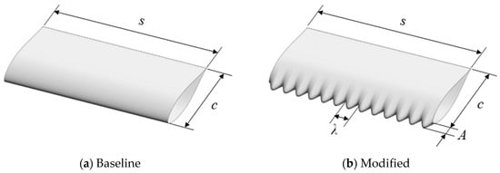 where ρ is the air density, V∞ is the freestream velocity, and A is the planform area of the baseline airfoil. It is important to note that the chord length of the baseline airfoil was used to normalize the aerodynamic coefficients for both the baseline and modified airfoils, even though the mean chord length of the modified airfoil is 5% larger. This decision follows the recommendation of Stalnov et al. [26], who suggested that the chord length at the valley section of a wavy airfoil with leading-edge tubercles is more appropriate for normalizing aerodynamic coefficients.