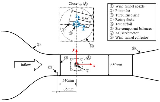 The experiments were conducted in a Göttingen-type circular wind tunnel at the Fluid Engineering Laboratory of Mie University in Japan. The wind tunnel features a 650 mm × 650 mm square test section, with a freestream velocity range of 0 to 52 m/s. For a detailed description of the wind tunnel, refer to Refs. [23,24]. The experimental setup, including the test airfoil and associated equipment, is illustrated in Figure 2. A Pitot tube, located at the wind tunnel nozzle outlet, was used to monitor the freestream velocity. A removable turbulence grid was positioned between the Pitot tube and the test section to control the turbulence intensity. The test airfoil was mounted horizontally, with its ends connected to two rotary disks on the side walls of the test section. Two six-component force transducers (LFM-A Compact) were installed outside the walls to measure forces and moments. The entire support system was linked to an AC servomotor (Yaskawa Corp., Kitakyushu, Japan; SGMGH-04A1AH761), allowing for precise adjustment of the angle of attack via computer programming. Two Cartesian coordinate systems are used in this study, as shown in Figure 2. The x, y, and z axes represent the inflow, vertical, and spanwise directions, respectively, while the X, Y, and Z axes correspond to the coordinate system of the force transducers. The origins of both systems are located at the spanwise center of the airfoil, along the pitching axis, positioned at 0.6c from the trailing edge.