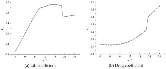 Among them, the uncertainties in the lift and drag forces were calculated according to Equations (1) and (2) and the error propagation formula, where the balance test values FX and FY have an uncertainty of ±0.5 N. The uncertainty in the AOA from the expected value is approximately ±0.1°. The freestream wind velocity uncertainty is ±0.5% of the expected velocity. The machining process introduces a dimensional error of ±0.2 mm in the chord and span lengths of the airfoils, and the uncertainty in the planform area was further calculated. Over the course of a single test, the maximum air temperature difference was about 3 °C, leading to an estimated air density uncertainty of ±0.006 kg/m3. The final lift and drag coefficient curves with error bars of the baseline airfoil at the Reynolds number of 4.5 × 105 are shown in Figure 3.