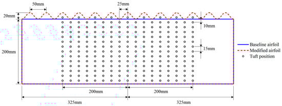 To observe the flow separation on the suction surface of the test airfoils, a tuft visualization experiment was conducted independently of the force measurements. The tufts were made of embroidery silk, and their arrangement and positioning are shown in Figure 4. Each tuft, 15 mm in length, was spaced 25 mm apart spanwise and 15 mm apart streamwise on the suction surface. The first row of tufts on the baseline airfoil was positioned 10 mm from the leading edge. In total, 13 rows and 17 columns of tufts were placed on the baseline airfoil, covering approximately two-thirds of the surface area around the span center. For the modified airfoil with extended leading-edge tubercles, an additional tuft was placed at each peak section.