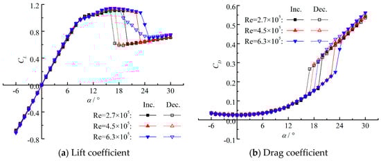 The aerodynamic performance of the baseline airfoil is illustrated in Figure 5 for Reynolds numbers ranging from 2.7 × 105 to 6.3 × 105. To account for potential hysteresis effects, both increasing and decreasing AOA cases were examined. The lift and drag coefficients of the baseline airfoil exhibit typical characteristics of combined trailing-edge and leading-edge stall, as defined by Mccullough et al. [49]. For all tested Reynolds numbers, the lift coefficient increases linearly with AOA up to approximately α ≈ 9°. Beyond this point, the increase rate of the lift coefficient slows, while the drag coefficient rises rapidly, indicating the onset and progression of trailing-edge separation. A semi-rounded peak in the lift curve is observed around α = 17° for all Reynolds numbers. As the AOA continues to increase past the stall angle, the lift coefficient experiences a significant drop, accompanied by a marked increase in drag. The stall angle increases from 20° to 25° as the Reynolds number increases from 2.7 × 105 to 6.3 × 105. The post-stall lift coefficient remains relatively low, around 0.7, and increases at a slow rate with further increases in AOA.