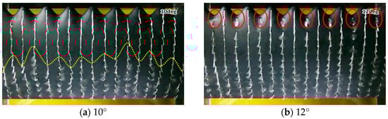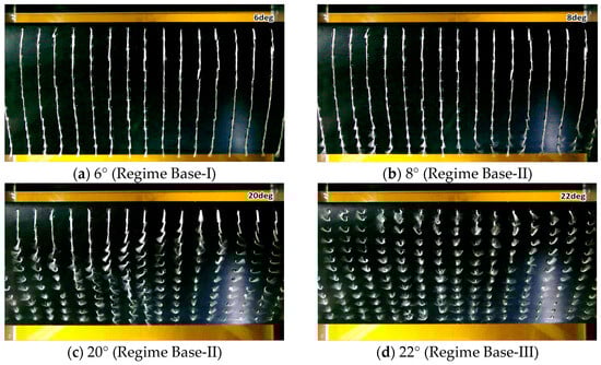 At different Reynolds numbers, the flow patterns remain generally similar, with the primary distinction being the transition process from Regime Mod-II to Mod-IV. At the lower Reynolds number of 2.7 × 105 (Figure 11), the Mod-III regime is absent. At an AOA of 10° (Figure 11a), trailing-edge separation with a wavy separation line is observed, characteristic of the Mod-II regime. When the AOA increases to 12° (Figure 11b), leading-edge separation appears across all valley sections, which is a key feature of the Mod-IV regime. At the higher Reynolds number of 6.3 × 105 (Figure 12), the AOA range of the Mod-III regime expands. The flow condition at 10° (Figure 12a) is similar to that at the lower Reynolds number and falls within the Mod-II regime. At 12° (Figure 12b), the Mod-III regime is observed, with local leading-edge separation occurring on two valley sections within the viewing window. At 14° (Figure 12c), the number of valley sections experiencing local stall increases to six, though two valley sections remain in trailing-edge separation. When the AOA reaches 16° (Figure 12d), the Mod-IV regime is fully established, with leading-edge separation present on all valley sections.