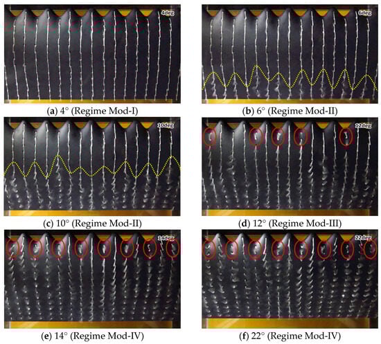 Figure 10 presents the tuft visualization results of the modified airfoil at the AOA increasing branch with a Reynolds number of 4.5 × 105. At an AOA of 4° (Figure 10a), the flow remains nearly fully attached, a state referred to as Regime Mod-I. As the AOA increases to between 6° and 10°, trailing-edge separation becomes evident, with more pronounced separation occurring along the valley sections, as shown by the wavy separation line in Figure 10b,c. This flow condition is classified as Regime Mod-II. At an AOA of 12° (Figure 10d), a new flow regime emerges, termed Regime Mod-III. In this regime, leading-edge separation is observed on some valley sections, where the first tuft near the leading edge exhibits strong, erratic motion, highlighted by red circles. For other valley sections not annotated, three to four tufts near the leading edge point stably downstream, indicating trailing-edge separation without leading-edge separation. On the peak sections, the flow remains attached for the distance of five tufts and points directly downstream, with no spanwise component. At AOAs of 14° and above (Figure 10e,f), all valley sections experience leading-edge separation. In this regime, spanwise interaction intensifies, resulting in a strong lateral component in the attached flow over the peak sections. This distinctive flow condition is classified as Regime Mod-IV.