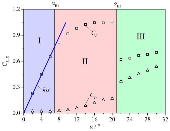 To provide a more quantitative analysis of the lift coefficient curve for the baseline airfoil, several characteristic parameters are defined and illustrated in Figure 13. The slope of the linear segment of the lift curve is denoted as k. The critical AOA between Regions B-I and B-II is defined as αB1, while the critical AOA between Regions B-II and B-III is defined as αB2. Additionally, the maximum lift coefficient CL, max is also selected as a key parameter for assessing the lift curve. The main parameters of the lift curve for the baseline airfoil at various Reynolds numbers are summarized in Table 1. It is observed that as the Reynolds number increases, αB1 tends to decrease, while αB2 tends to increase. The slope of the linear segment, which is slightly greater than the theoretical value of 2π, increases with the Reynolds number. Similarly, the maximum lift coefficient also shows an upward trend as Reynolds numbers increase.