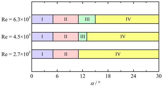 Distribution of different flow regimes at different Reynolds numbers based on tuft visualization result (I, II, III, and IV represent Regimes Mod-I, II, III and IV, respectively).