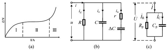 When an ac voltage is applied, the current in the dielectric equivalent circuit can be separated into active and reactive components [2]. This allows the creation of a simplified equivalent circuit model, as depicted in Figure 1c. The leakage current, denoted as that produced by the voltage phasor at any given frequency, can be separated into a resistive component and a capacitive component . These components can be represented by their equivalent circuit models, which are a resistor Rp and a capacitor Cp, respectively.