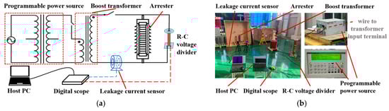 An experimental circuit is used to test the arrester and its discs. (a) design of the circuit; (b) photo of the built circuit.