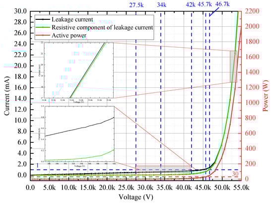 First, 0–55 kV fundamental frequency voltage is applied to the arrester to obtain its electrical characteristics. The tested results of Figure 4 demonstrate that when the voltage applied is less than the rated voltage (42 kV), the leakage current is very small (less than 0.8 mA) and keeps a linear correlation with the voltage, indicating that the arrester operates within the linear range (see Region Ⅰ of Figure 1a). When exceeding the rated voltage, the arrester operation turns to the nonlinear range (see Region Ⅱ of Figure 1a), causing a rapid increase in leakage current. This effect becomes more evident when the leakage current exceeds 1 mA (requiring 45.7 kV voltage), corresponding to 30 W active power. It is obvious that the resistive component of the leakage current and the active power have similar tendencies to the leakage current. At the voltage value of 46.7 kV, the resistive leakage current reaches 1 mA. By observing and comparing the two zooming-in parts of Figure 4, it is found that the resistive component of the leakage current is much smaller than the total leakage current in the linear region (lower applied voltage), while it becomes the dominant component when turns to the nonlinear region (higher applied voltage). This means that increasing the voltage applied to the arrester will result in considerable heat generation, which is also reflected by the nonlinear increase in active power (red line in Figure 4).