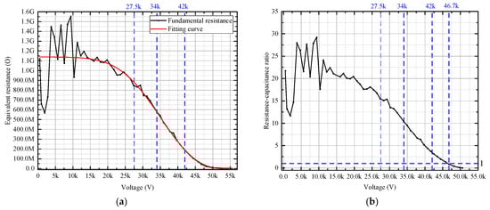 Figure 5a demonstrates a decrease in the equivalent resistance of the arrester as the applied voltage increases. When the voltage is below the rated voltage of the contact supply network (27.5 kV for Chinese cases), the equivalent resistance value is greater than 900 MΩ. At continuous operating voltage (34 kV), the value is 600 MΩ. For the rated voltage (42 kV), this value decreases to 200 MΩ. Keeping increase the voltage, it will further decrease to below 100 MΩ. It should be noted that within the low voltage range, the measured results exhibit a significant fluctuation due to the limited sensor precision for a very small leakage current signal. However, it is remedied by the fitting curve. A similar, varying tendency of the ratio of equivalent resistance (Rp) to equivalent capacitive reactance (1/jωCp) of the simplified arrester loss model (refer to Figure 1c) is shown in Figure 5b. It can be assumed that although the equivalent resistance apparently decreases along with the voltage increase, the equivalent reactance value remains stable. Specifically, as the arrester operation turns to the nonlinear region, the ratio goes below 1, meaning that the ratio can be chosen as an index for PHM purposes.