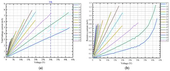 To investigate the volt-ampere properties of arresters when subjected to high-frequency harmonic voltages of the traction supply network, the 7th (350 Hz) to the 67th (3350 Hz) harmonic voltages are applied on the arrester. Figure 6a demonstrates a linear correlation between voltage and leakage current at various frequencies when the voltage applied is below 42 kV. It is apparent that for the same voltage amplitude, the leakage current increases along with the voltage frequency increase, e.g., the leakage current is 3.5 mA for 30 kV, 7th harmonic voltage, 5.5 mA and 7.3 mA for the 11th and the 15th harmonics respectively with the same amplitude. The main reason is that referring to the circuit model of Figure 1c, the equivalent resistance value of the arrester is extremely high within the low voltage range, so the equivalent capacitive reactance, which is a frequency-dependent quantity, dominates the arrester equivalent impedance. The very small values of the resistive component of the leakage current of Figure 6b also prove this hypothesis. However, it looks strange that the resistive current, commonly seen as frequency independent, still increases with the voltage frequency, which is similar to the total leakage current. This can be explained by the equivalent circuit model of Figure 1b, where a polarization branch exists. Particularly, under the low voltage range, the polarization resistance is the dominant component of the equivalent resistance of the arrester. Obviously, the polarization branch, consisting of a resistor and a capacitor connected in series, is frequency-dependent.