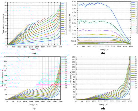 Harmonic voltages from the 7th to the 67th were applied to the ZnO disc. As shown in Figure 7a, the leakage current of the disc exhibits a linear correlation with the voltage under 4000 V regardless of the frequency. Exceeding 4000 V, the leakage current shows a nonlinear increase. The equivalent resistance given in Figure 7b remains constant under a low voltage range for each frequency, while it shows a negative correlation with the frequency. In fact, this is consistent with the arrester property within the linear region shown in Figure 6. It is noteworthy that with the increase of the applied voltage, the equivalent resistance reduces nonlinearly and tends to be frequency-independent. This evidence shows that as voltage increases, the disc enters a nonlinear operation region with a rapid increase in its conductance, i.e., the equivalent resistance R representing the conductance branch of the circuit model of Figure 1b becomes dominant. In other words, it is proved that a high electric field intensity leads to an increase in the conductivity of the disc material. Specifically, the equivalent resistance goes below 300 kΩ when the voltage is close to 4500 V, except for the 7th harmonic. As a result, the nonlinearities of the resistive current and the active power are given in Figure 7c,d, which are similar to what was found by arrester fundamental tests (see Figure 4).