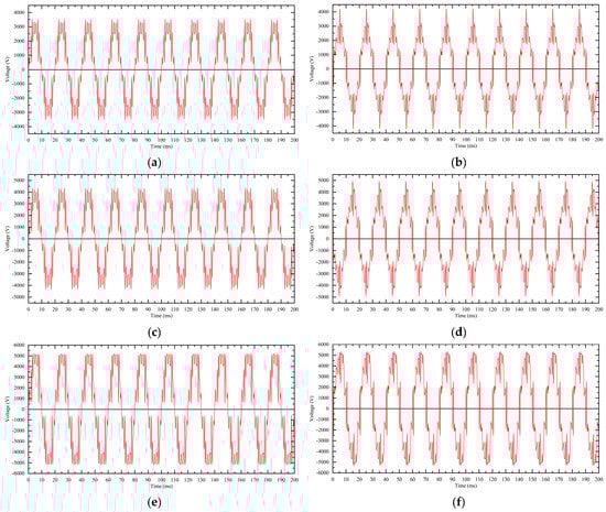 The last set of tests considers six combined voltages, which are divided into three groups, as shown in Table 2. In each group, the fundamental as well as four harmonics are set to the same amplitudes in root-mean-square (RMS). The fundamental voltage values of 2000 V, 2500 V, and 3000 V are related to one-fourteenth of the traction supply network voltage (27.5 kV), continuous operating voltage (34 kV), and rated voltage (42 kV). By controlling phase angles of the harmonics, different peak values of the combined voltage waveforms are obtained, as shown in Figure 8.