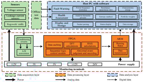 - Data processing layer (see orange blocks in Figure 9). The basic architecture of this layer is formed by an FPGA chip and an ARM chip. The former is mainly responsible for the calculations of discrete Fourier transform (DFT), RMS, and abnormal event judgment. The latter accounts for operating status display and data communication with the host PC.