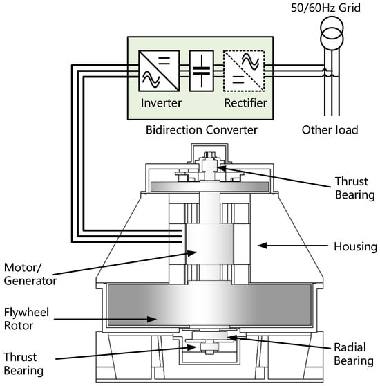 As shown in Figure 1, for a flywheel energy storage system (FESS), the flywheel and motor/generator supported by bearings are enclosed in a vacuum chamber. The motor/generator is driven in acceleration or deceleration by the bi-directional converter as a power electronic interface, which controls the flowing of the energy between the power source, the load, and the flywheel energy storage unit (FESU). The typical energy capacity is 0.5–125 kWh, and the power bulk is 100–3000 kW for an FESU.