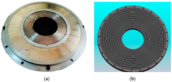 Bearings were used to constrain the rotational axle of the shaft connecting the flywheel and the motor’s rotor. Rolling bearings, oil film bearings, permanent magnetic bearings, active magnetic bearings [78], and high-temperature superconductivity magnetic bearings (HTSMB) [79] are investigated in China. Bearing friction is responsible for the high idle loss of the flywheel, which is overcome by magnetic levitation without friction at the cost of active precision control. Bearing load and rotor dynamics of flywheel motor rotor shaft are also an important concern for smooth running with lower vibration. A large permanent ring was assembled from sector blocks to obtain a bearing load ability of 50 kN, as shown in Figure 4a. Figure 4b displayed the Halbach array ring of permanent repulsive bearing with a load of 100 kN.