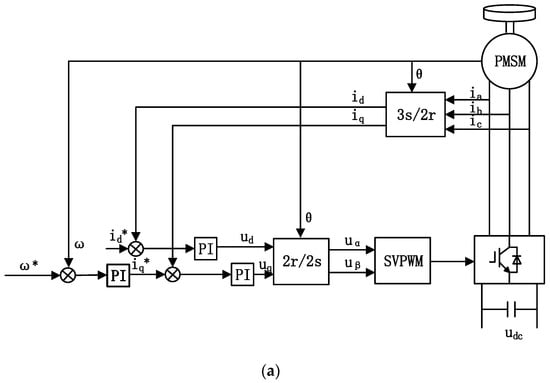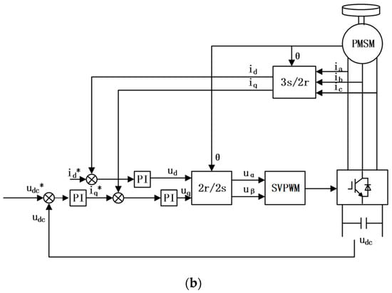 Current is the core of a motor driven by power electronics. A current prediction control scheme was employed to reduce the commutation torque ripple [130]. A decoupling algorithm was added to the inner current loop to erase the influence of cross-coupled voltage [131]. The load current and rotor speed were compensated to the nonlinear outer DC bus voltage loop, and the feedforward decoupling game was also utilized in the inner current loop to realize the independent current control [132]. To solve the problem of id and iq of the permanent magnet synchronous machine in large overshoot and oscillation during the regenerative braking process, the complex current regulator demonstrated an improving response compared with the other regulators [133].