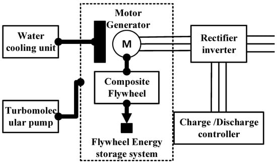 As shown in Figure 6, an integration flywheel energy storage system includes a flywheel, motor, bearing, inverter, and assistant devices such as a chamber, monitoring instrument, cooling equipment, and vacuum bump. The assistant devices are fatal to FES integration, efficiency, safety, and reliability. The windage loss of a composite flywheel in a vacuum chamber was calculated. If the pressure is lower than 0.1 Pa, the windage loss is very small, and the windage loss could be omitted if the pressure of the chamber is lower than 0.01 Pa [139]. To improve energy efficiency, the motor power should be high and short of charging–discharging with a short idling period [140]. An interior molecular pump of flywheel energy storage devices was designed using computational fluid dynamics method to analyze its vacuuming performance [141].