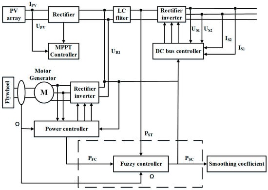 The flywheel energy storage systems act as power smoothing and voltage regulating parts in wind and solar energy systems with an inherent intermittent nature. The power quality and stability of wind power generation were enhanced by flywheel energy storage [149]. The relationship between the “disturbance current” and the stator current was analyzed for the balance of the power on the DC link side and the electromotor side [150]. A fuzzy neural network control strategy was used to regulate DC bus voltage in the wind power generation system combined with flywheel energy storage [151]. The control algorithm of the full power back-to-back modulating pulse-width converter of the permanent magnet synchronous generator was analyzed to smooth the active power of the wind power generator [152]. According to the structure and control targets of the wind generator and multi-functional flexible power conditioner with an FES system with a doubly fed induction motor, the control tactics were proposed to regulate the active power of the system using fuzzy logic inference [153].