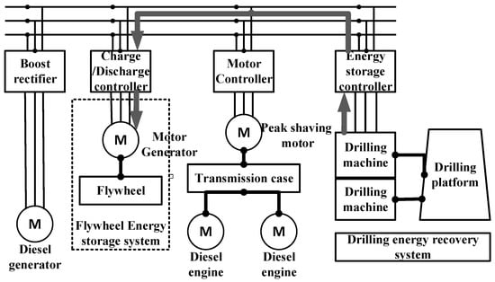 The flywheel energy storage and diesel generators in the microgrid are feasible and efficient and can improve the anti-accident ability of the microgrid [183]. The optimized control method of FESS was designed and applied for the oil rig, in which the flywheel stored the excess energy in light load operating and released energy when the power unit was overloaded [184] (seeing Figure 10). The test data of rig trip in peak regulation showed that the 400 kW/16 MJ flywheel energy storing and power peak shaving system could rapidly respond to load changes and reduce the rotary speed drop of diesel engines by 50% under the impact load [185]. The FESS is quite suitable for hybrid electric vehicles in braking energy recovery [186].