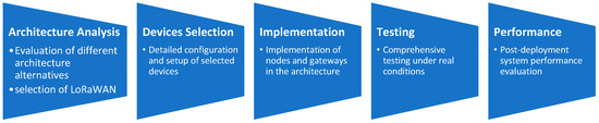 To meet the project’s objectives and address the application’s specific communication needs, we adopted a methodological process from the architecture’s conception to its deployment (see Figure 2). We began with a detailed analysis of various alternatives, including Sigfox, NB-IoT, and Zigbee, (comparison and detailed information available in Samad et al. [31] and Mekki et al. [32]), ultimately selecting LoRaWAN for its optimal combination of wide coverage, energy efficiency, and versatility. We conducted rigorous evaluations on key criteria such as range, energy consumption, costs, and scalability. The decision to use LoRaWAN laid a solid foundation for the project’s success.