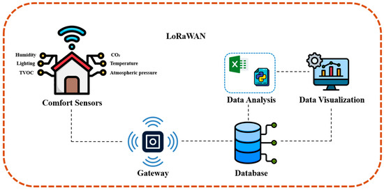 These advancements and the efforts for energy efficiency in buildings have led to the increasing adoption of Building Automation Systems (BAS) [22,23,24]. BAS integrates various building functions to enhance comfort, operational efficiency, and energy management. However, implementing BAS, especially in existing structures, can be technically challenging, costly, and visually intrusive. Emerging technologies like LoRaWAN (Long-Range Wide-Area Network) provide a promising alternative for enhancing building automation [25,26]. LoRaWAN is a low-power, wide-area networking protocol that supports the wireless communication of IoT devices over long distances with minimal power consumption. Its application in smart-building management allows for the efficient monitoring and control of indoor environmental parameters, offering a cost-effective solution for retrofitting older buildings with modern comfort and energy management systems.