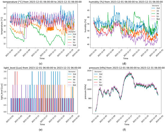 Lastly, the atmospheric pressure data showed a consistent pattern of fluctuations across all apartments, with pressure levels generally ranging between 990 hPa and 1020 hPa (Figure 4f). A notable peak occurred around mid-December, where pressure values reached approximately 1020 hPa, followed by a gradual decline towards the end of the month, dropping below 1000 hPa. The synchronization of pressure trends across the apartments suggests that these changes were predominantly driven by external atmospheric conditions rather than specific indoor factors. This uniformity indicates that regional weather patterns likely influenced indoor environments, which could affect factors such as ventilation and air quality, depending on the building structure and location.