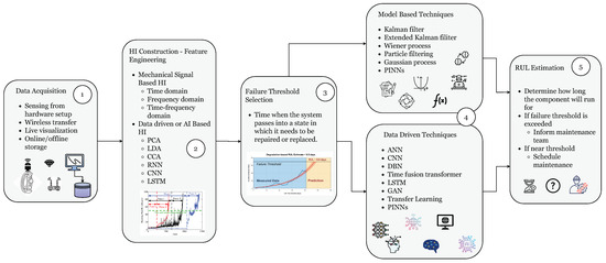The authors of this study fill these gaps by providing a review of the five steps of RUL estimation in detail. These include (1) data acquisition, (2) feature engineering for HI construction, (3) failure threshold (FT) selection, (4) RUL estimation techniques, and (5) evaluation metrics. The RUL estimation process is divided into five steps for several key reasons. Firstly, this division provides a structured framework that systematically addresses the essential components involved in RUL estimation, helping to organize the review and guide readers through the process logically. Secondly, it ensures comprehensive coverage, as each step represents a critical aspect of the RUL estimation process, from the initial data collection to final evaluation. Thirdly, this focus on five distinct steps allows for clarity and precision in defining and discussing each stage’s specific methodologies, challenges, and advancements. In addition, this study provides a review of the transfer-learning-based approaches and physics-informed neural-network-based approaches used for RUL estimation, which have gained increased attention in the past few years. Figure 1 shows the generic flow of the RUL estimation process, highlighting each major step of RUL estimation.