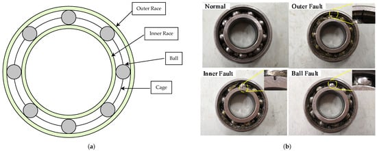 Bearing faults make up to 30–50% of all faults in IMs [17,18,19]. A bearing is the component that supports and allows for the smooth rotation of the rotor shaft [20]. Bearings must be regularly inspected and lubricated to prevent wear and potential failure [21]. A bearing has four components: an inner raceway, an outer raceway, balls, and a cage that provides an equidistant arrangement between the balls. There are four corresponding faults associated with these components: inner race faults, outer race faults, rolling element faults, and cage faults. An additional fault could be a combination of any of the four faults mentioned above. When there is a fault on the surface of an inner or outer race in a bearing, the impacts caused by the rollers striking the imperfection excite resonant frequency bands and induce transients over time [6]. The fault frequencies at which these faults can be detected are provided in Equations (1)–(4) [22]. The structure of a rolling bearing can be seen in Figure 2a, with the faults that can occur in Figure 2b.