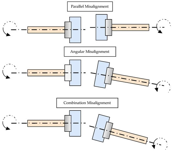 Misalignment faults can occur for several reasons, such as installation errors, thermal expansion, wear and tear, and improper maintenance [21]. Thermal expansion can also cause machine components to shift position, leading to shaft misalignment [29]. Misalignment faults, while less common, can still have significant effects. Incorrect alignment of a drive shaft with the load can cause uneven loading and premature wear on components. When the center of mass does not lie on the axis of rotation, such as with a heavy spot on the rotor [35], this can create an imbalance and lead to vibration and wear. Installation errors, such as improper mounting of bearings or gears, can also cause misalignment and contribute to premature failure. Failure in bearings can be a consequence of misalignment faults, further exacerbating the issue and leading to additional damage. The three types of faults associated with misalignment are shown in Figure 4.