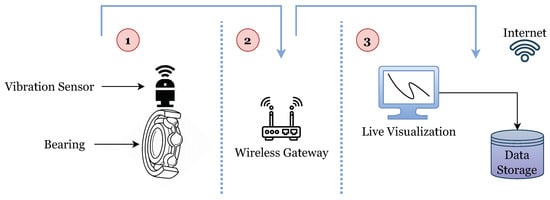 Data acquisition is the first step in prognostics, providing basic condition monitoring information for RUL prediction [7]. It is the process of capturing and storing different kinds of monitoring data through sensors installed on the respective equipment. The most commonly used sensors for data acquisition are vibration sensors (accelerometers), current sensors, infrared thermometers, temperature sensors, pressure sensors, etc. In practice, the most extensively used data for RUL estimation of mechanical components are vibration data [37]. Run-to-failure data are the most significant when it comes to RUL prediction, as they contain degradation trends for the component. The recorded data are stored at a memory location for further analysis. Figure 5 shows the data acquisition process using wireless devices. The vibration data collected by a sensor are sent through a gateway to a storage location. The data can also be visualized in real time, depending on the type of data acquisition setup used. Advancements in sensor and communication technologies have resulted in the development and use of more complex data acquisition systems in industry. Despite these advances, acquiring high-quality run-to-failure data for machinery remains a difficult task for academic research [7,38]. A systematic review conducted by Lei et al. [7] outlined the following challenges associated with high-quality run-to-failure data acquisition.