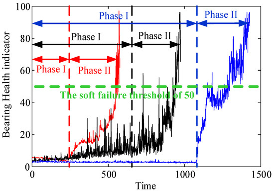 Figure 6 shows the HI trajectories for three different bearings, consisting of defect frequencies and harmonics. It can be seen that the HI has two distinct phases throughout the degradation trend. These are Phase I, where the component is in its normal operating condition (healthy), and Phase II, where, after a large change in the HI, the component enters a fault mode and starts to degrade exponentially until failure. The limit for failure can be set by the user, depending on their needs. Upon observing the plots above, it can be said that HIs can be instrumental in visualizing degradation trends and also can aid in better RUL estimation compared to directly using raw data.