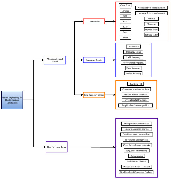 Mechanical signal processing plays a crucial role in the identification and analysis of initial anomalies, the extraction of fault-related characteristics, and the development of HIs for bearings and gears [6,52]. Its profound utility stems from its capability to effectively isolate the pertinent components of interest from sources of considerable noise and undesired vibrational elements. After careful pre-processing of a mechanical signal (vibration signal), three conventional feature extraction methods, including time domain, frequency domain, and time–frequency domain, can be used to construct an HI [52].