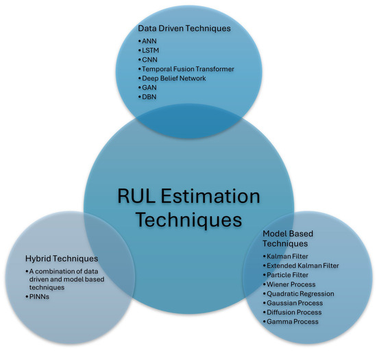 Regarding the database used, journal articles, books, and conference proceedings of standard engineering repositories were consulted (IEEE Xplore, Elsevier, Springer, MDPI, Wiley, and others, as per the references). Up to 90% of the publications reviewed concerning RUL estimation are journal articles, with the majority of them spanning between 2017 and 2024. In addition, the remaining 10% contained books, technical reports, and conference proceedings spanning the past decade. Some very recent exceptional review papers were also used in conducting this review. The authors took utmost care in searching the databases for literature, such that all relevant information is covered about the fundamentals of the prognosis of RMs.