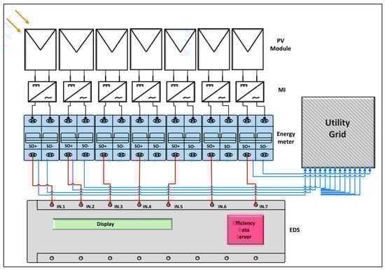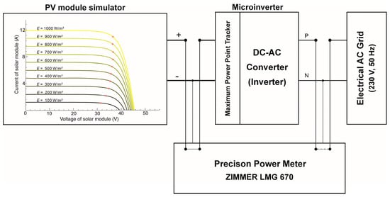 For the PV outdoor test lab (see Figure 3) installed on the roof of Paderborn University (51.707° N, 8.771° E), a specific test system was employed. Figure 3 depicts the electrical layout of the system, including the PV modules on top with the attached microinverters and the measurement system. Each PV module consisted of 60 solar cells from the same batch of the factory. In the stated plant, these equal and calibrated modules were the input for each microinverter. The goal of the investigation was to analyse the performance of the inverters under real operating conditions, comparing their energy yield simultaneously with the climatic conditions and solar irradiance. The climatic conditions were monitored during the whole test period. The meteorological monitoring equipment consisted of two calibrated pyranometers in the plane of the module (CMP 21 and SP 2 lite by Kipp and Zonen), a 3D ultrasonic anemometer (by Thies), a thermo-hydro sensor (by Thies), and a thermo-moisture metre with a wind sensor, which was WXT 520 (by Vaisala). Each microinverter was directly connected to a calibrated electrical energy metre with an S0-interface (see Figure 3). To ensure an accurate yield measurement, the calibrated electrical energy metres were replaced on a regular basis with freshly calibrated ones. All S0-interfaces were connected to a server-based data acquisition system.
