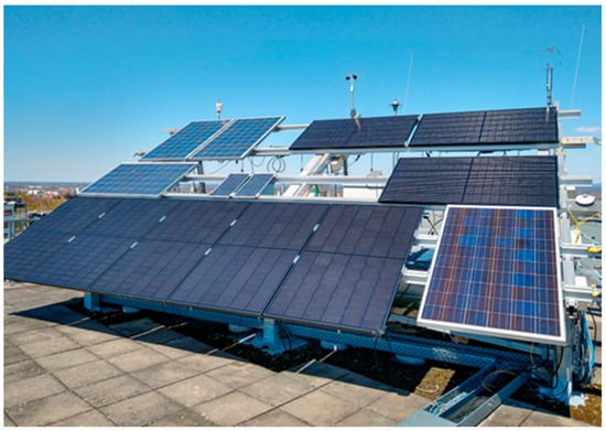 We used 215 Wp modules until 2020, and from 2020 to 2024, we used ten 360 Wp modules (lower row, from left), as shown in Figure 4. The modules were manufactured by Solarwatt®, and the power output at the STC of each module was measured in the factory (Dresden, Germany). Additionally, one module was sent for a precision measurement to the testing laboratory ISFH (Hameln, Germany). The factory measurements were found to be very accurate (362 Wp vs. 359.34 Wp ±3% at ISFH in July 2021). In 2024, the modules were substituted with modules with a nominal power of 405 Wp, also manufactured by Solarwatt®.
