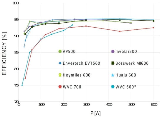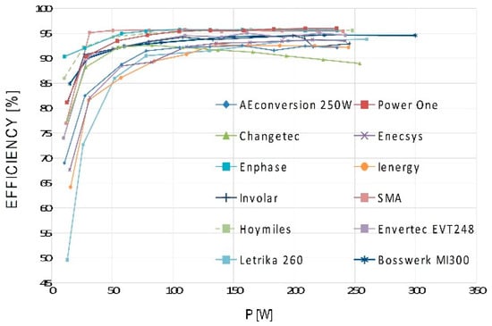 Measured DC–AC conversion efficiencies as a function of power outputs for 12 microinverters with single PV module inputs.