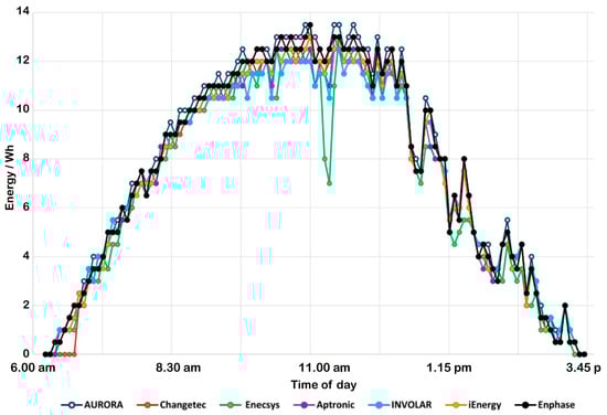 Actual recorded data of AC energy generation of seven microinverters (over integrals of 5 min) during the day on 6 April 2015.