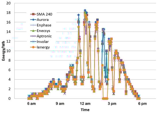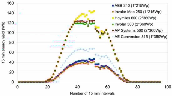 Example of electrical energy yield measurements (during intervals of 15 min) of different inverters and two different PV module sizes during a mostly clear day (some clouds in the afternoon).