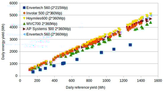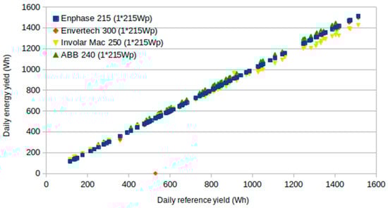 Electrical energy yields of different inverters for single PV modules, each connected to a single 215 Wp module. The daily reference yield (x-axis) is the energy yield (AC) achieved by an Enphase M 215 inverter with a single 215 Wp module attached.