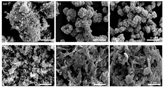 The XRD patterns of the synthesized samples were collected using an X-ray diffractometer (XRD, D8 focus, Bruker Corporation, Billerica, MA, USA) with Cu Kα radiation, scanning over a 2θ range from 10° to 80°. Their morphology and microstructure were observed using a scanning electron microscope (SEM, Apreo 2C, Thermo Fisher Scientific, Waltham, MA, USA).