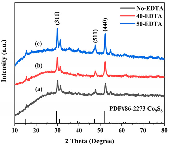 Based on the abovementioned SEM and XRD results, the effects of Na2EDTA and ethanol on the Co9S8 samples are as follows. Na2EDTA was conducive to the crystallization and growth of Co9S8 crystallites since it can coordinate metal Co2+ ions to form stable Co-Na2EDTA intermediate complexes [23]. Under the subsequent hydrothermal conditions, Co9S8 crystal nuclei would slowly form and gradually grow into uniform nanosheets, due to the change in the surficial free energy, the stabilization of certain crystallographic planes by Na2EDTA, and the intrinsic anisotropic growth [20]. In addition, Na2EDTA can induce the self-assembly of 2D nanosheets into 3D hierarchical cage-like microstructures [19]. Moreover, water has a higher surface tension (γ) of (72.7 mN/m) than ethanol (22.3 mN/m) [24], so the Co9S8 nanosheets became irregular (like granulates) to reduce the surface Gibbs free energy when only using water as the solvent. However, the 50-EDTA sample still maintained a hierarchical micro/nano architecture.