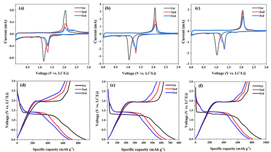 Cyclic voltammetry profiles of the (a) No-EDTA, (b) 40-EDTA, and (c) 50-EDTA samples as electrodes at 0.2 mV s−1 in the voltage range of 0.01–3.0 V; charge–discharge curves of the (d) No-EDTA, (e) 40-EDTA, and (f) 50-EDTA samples as electrodes at 0.1 A g−1.