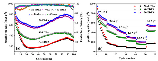 Cycle performance and corresponding Coulombic efficiencies at 0.1 A g−1 (a) and rate performance (b) of the No-EDTA, 40-EDTA and 50-EDTA samples as electrodes.