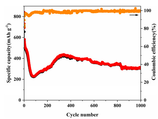 Furthermore, the long-term cycling stability of the 50-EDTA electrode is also shown in Figure 5. The 50-EDTA electrode maintains a high capacity of 303.5 mAh g−1 after 1000 cycles even at a high rate of 1.0 A g−1, showing promising potential as an anode material in high-capacity LIBs. As shown in Table 2, the electrochemical performance of the 50-EDTA electrode is also superior to other Co9S8 materials reported previously [27,31,32,33,34].