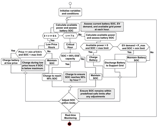 The battery charges at a reduced cost during low-price hours (0 to 6 h), provided that the price of power is at its lowest and the state of charge (SOC) is below the top limit; if not, the SOC remains unchanged. In order to satisfy expected needs, the system makes sure the battery achieves at least 95% SOC during the critical hour (7th hour). If the SOC is already sufficient, it is maintained. The system bases its judgments on SOC levels and power availability during non-critical hours. The battery charges if electricity is available and the state of charge is lower than the maximum. The battery drains to assist the grid if the EV’s power consumption is over the maximum power threshold and the SOC is higher than the minimum. If neither need is satisfied, the SOC remains stable, as no charging or discharging occurs.