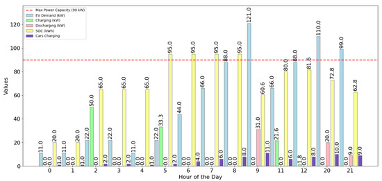 Through the use of advanced algorithms that rely on current electricity pricing and data on electric vehicle demand, the framework has the ability to enhance operational results and reduce dependence on traditional grid resources. In the face of changing energy needs and environmental problems, these innovations improve grid resilience and contribute to sustainable energy solutions. Figure 2 presents a comprehensive hourly overview of the operations and interactions between the energy storage system (ESS), electric vehicle (EV) demand, and associated power management activities within a controlled parking lot environment. This line and bar chart illustrates the interaction between EV demand, state of charge (SOC), and charging/discharging activities throughout a 24 h period.