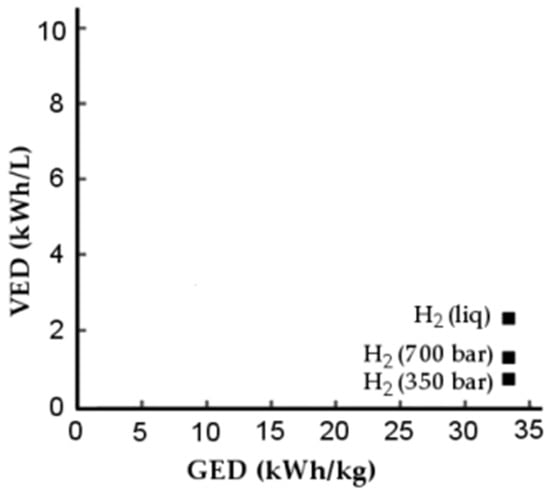 As aforementioned, hydrogen has a high HHV of 141.9 J∙kg−1. However, in terms of energy per unit volume, in the liquid state, it has a very low heating value of 10.10 J∙m−3 []. In Table 1, such values can be compared with the homologous values of other fuels.