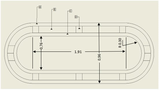 Tank considered in the current study. Legend: A—external wall in contact with ambient air; B—insulation; C—inner wall in contact with hydrogen; D—elements for structural integrity.
