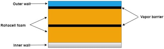 As an example of a multilayer insulation system, a solution based on two sections of Rohacell® foam together with two vapor barriers is shown; see Figure 6 []. The vapor barrier is separated from the Rohacell® foam using a polyester film and two aluminum sheets [].